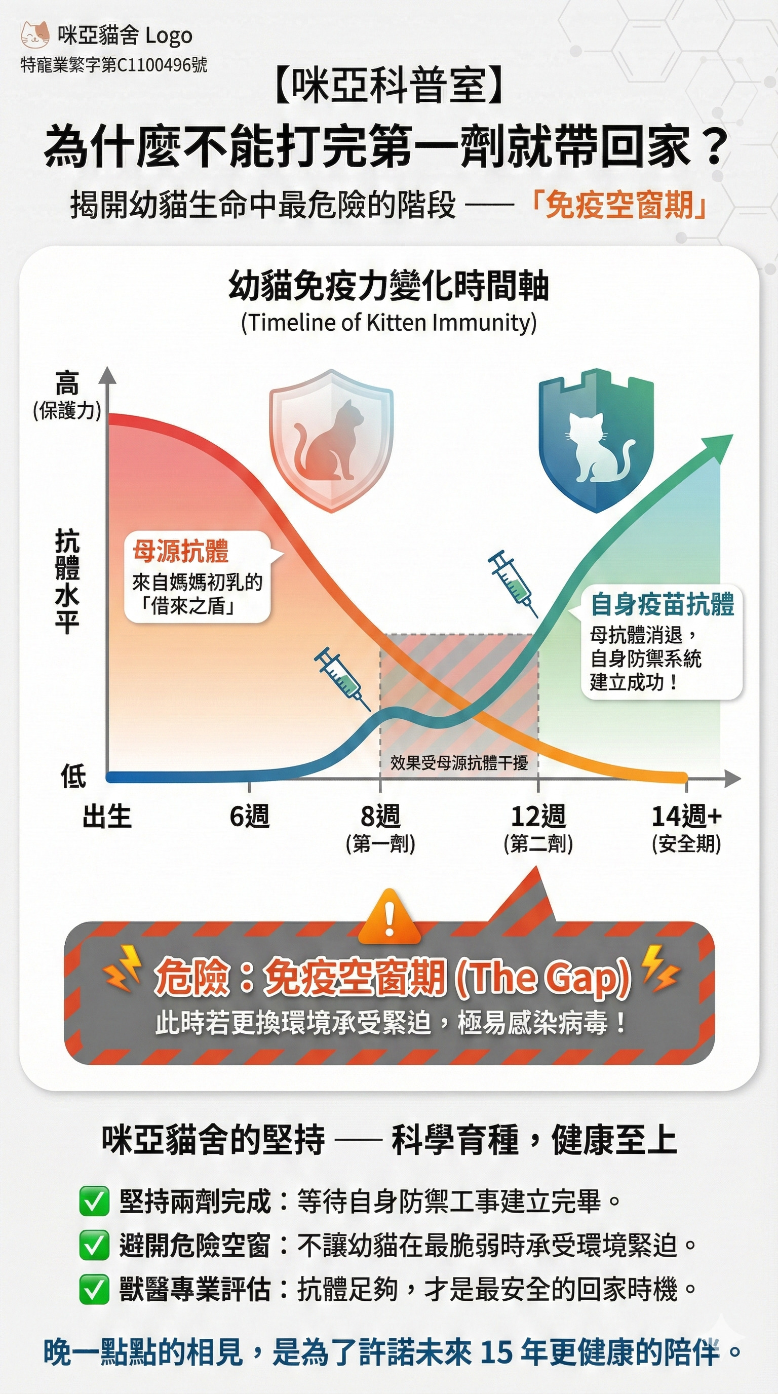 這不是為了刁難,而是為了避開幼貓生命中最危險的階段 —— 「免疫空窗期 (Immunity Gap)」。